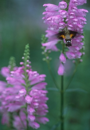 [ 花と虫たち −その4− ] 今回はスズメやホウジャクなどの名で呼ばれるスズメガ科の愛らしい2種を 各2枚の写真でご紹介します。 ![]() 「ホシホウジャク−1」 MARK12 9月上旬、Nikon F3HP改、micro-105mm F2.8、1/125sec、絞りf 2.8、RDP III カクトラノオ(ハナトラノオ)の花をホバリングしながら 吸蜜するホシホウジャクをサイドから写したものです。 ![]() 「ホシホウジャク−2」 MARK12 9月上旬、Nikon F3HP改、micro-105mm F2.8、1/125sec、絞りf 2.8、RDP III ホシホウジャクの後ろ姿です。ホウジャクは頭が小さく、前胸部も細いです。 ホシホウジャクの特徴的な3枚の尾ビレが見てとれます。 ![]() 「オオスカシバ−1」 MARK12 9月下旬、Nikon F3P、micro-105mm F2.8、1/250sec、絞りf 4+1/2、RDP III ペンタスの花(赤、ピンク、白等があります)を吸蜜中のオオスカシバです。 名前のように羽根が透けいて、オリーブ緑色の紡錘型の体がグラマラスです。 尾の部分は毛の束になっていいるところがホシホウジャクと違っています。 ![]() 「オオスカシバ−2」 MARK12 9月下旬、Nikon F3P、micro-105mm F2.8、1/250sec、絞りf 4+1/2、RDP III オオスカシバを斜め後方から撮ったものです。 腹部には赤色が入った黒い帯があるのもオオスカシバの特長です。 |