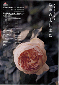出演: ピポ・クラシック/ fl.宇佐美 敦博 pf.市橋あゆみ m.c.宇佐美 典子 一般\2000/小中学生\1500 詳細はこちら。 お問い合わせ:ピポ・クラシック(宇佐美) ◆ 長久手町文化の家フレンズ17年度総会 ◆ (ミ二・コンサート) <終了> 2006 4月8日(土) 19:00 長久手町文化の家 出演: ピポ・クラシック ( fl.宇佐美 敦博 pf.市橋あゆみ m.c.宇佐美 典子) フレンズ会員向 ◆ 南知多 源氏香 音夜会 (ラウンジ・コンサート) ◆ 2006 4月1日(土) 20:00前後 1階ラウンジ 2006 4月2日(日) 20:00前後 1階ラウンジ <終了> 出演: ピポ・クラシック ( fl.宇佐美 敦博 pf.市橋あゆみ m.c.宇佐美 典子) お問い合わせ: 源氏香 TEL.0569-62-3737(代) ◆ 長久手ダンスシアターⅢ ゆめのまにまに ◆ 2006 3月4日(土)19:00~ 2006 3月5日(日)16:00~ <終了> 長久手町文化の家 森のホール ![]() 詳細はこちら 【構成・演出】 山田珠実 【音楽監修】 野田雅巳 【演奏】 per.小川真由子 fl.宇佐美敦博 pf.野田雅己 主催 :長久手町 お問い合わせ:長久手町文化の家 電話:0561-61-3411 ◆ 南知多 源氏香 音夜会 (ラウンジ・コンサート) ◆ 2006 2月4日(土) 20:00前後 1階ラウンジ 2006 2月5日(日) 20:00前後 1階ラウンジ <終了> 出演: ピポ・クラシック ( fl.宇佐美 敦博 pf.市橋あゆみ m.c.宇佐美 典子) お問い合わせ: 源氏香 TEL.0569-62-3737(代) ◆ ミニコンサート ◆ 2006 2月8日(水) 長久手町 グループホーム「よろこんぶ」 <終了> 出演:Vn.横田真規子 Fl.宇佐美敦博 Pf. 市橋あゆみ 主催 :長久手町 (長久手町文化の家 音楽デリバリー事業) ◆ ミニコンサート ◆ 2006 1月25日(水) 長久手町 児童館 <終了> 出演:Vn.横田真規子 Fl.宇佐美敦博 Pf. 市橋あゆみ 主催 :長久手町 (長久手町文化の家 音楽デリバリー事業) ◆ 南知多 源氏香 音夜会 (ラウンジ・コンサート) ◆ 2006 1月7日(土) 20:00前後 1階ラウンジ 2006 1月8日(日) 20:00前後 1階ラウンジ <終了> 出演: ピポ・クラシック ( fl.宇佐美 敦博 pf.市橋あゆみ m.c.宇佐美 典子) お問い合わせ: 源氏香 TEL.0569-62-3737(代) 2007年← 2006年 →2005年